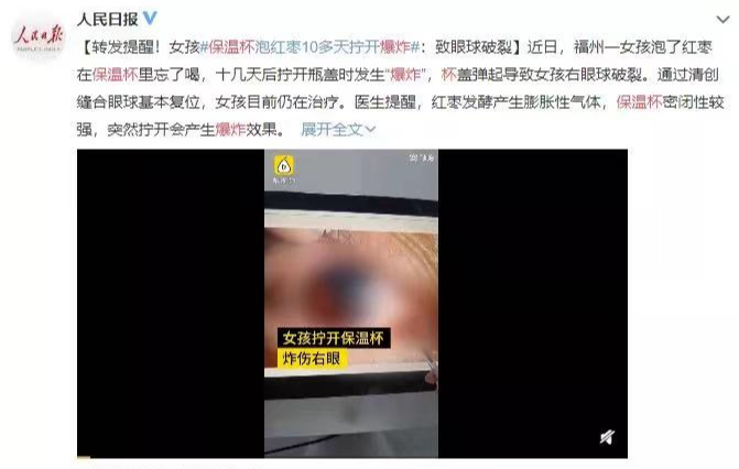 福建一女孩用保温杯泡红枣,但忘了喝,10多天后准备拿去清洗,结果用力拧开盖子时,杯盖突然弹起砸向眼睛导致右眼球破裂。